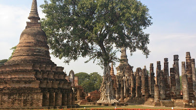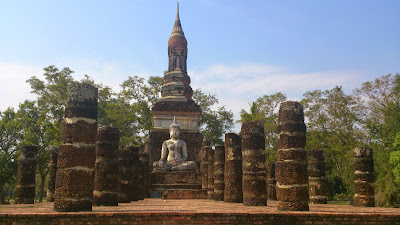 Pidasime plaani ja võtsime templite (Sukhothai Historical park) külastamiseks mitu päeva hoogu, et minna. 13ndal kuni 14ndal sajandil oli Sukhothai samanimelise kuningriigi pealinn. Juttude ja loetud kirjanduse järgi pidi olema väga suur ala, ikkagi 70 km2. Ala ise jaguneb korrapäraselt viieks tsooniks ja neid kõiki piirab müür. Igale alale on eraldi müüri keskel ja tasuline sissepääs ( a 100 B pilet pluss veel 10 B, kui soovid ala läbida jalgrattal, jalgratta rentimine maksab a 30 B). Meie eesmärk oli läbida keskmine tsoon. Seal asub kõige rohkem templeid, varemeid, tiike ja tundus ka kõige huvitavam. Kesktsoonis asub ka kompleksi kõige suurem ja tähtsaim tempel Wat Mahathat. Olgu öeldud, et turistilõksuga rattaid rentida, me kaasa ei läinud. Ja õigesti tegime. Keskmise ala läbis ilusasti rahulikult jalutades u1,5 tunniga. Rattad oleksid isegi segavaks muutunud, sest nendega sa sildade ja saarekeste peale ei saa ja samuti tuleb ratas templimüüri taha jätta. Võib-olla, et kui oleks soovinud kogu viite tsooni külastada, siis oleks neist abigi olnud. Aga kesktsoonis saab lihtsamini liikuda jalgsi. Isegi keskpäeval oli seal täiesti mõistlik, sest suurte puude laiad võrad pakkusid piisavalt päikese eest varju.